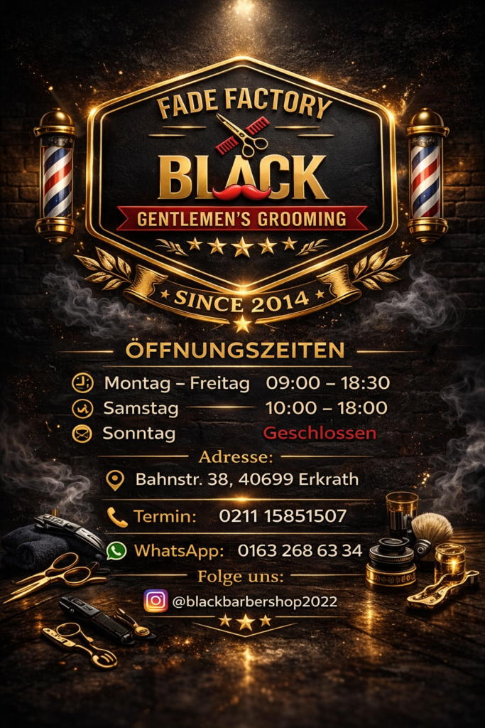 / 01 Perfect Haircuts Bei Black Barber in Erkrath bekommst du saubere, präzise Haarschnitte und perfekte Fades.Wir arbeiten schnell, professionell und ohne lange Wartezeiten. Egal ob klassischer Schnitt oder moderner Fade – wir liefern dir den perfekten Look.Komm vorbei oder sichere dir direkt deine Read More / 02 Unsere Leistungen Top Qualität für deinen Style herrenhaarschnitt Sauberer Schnitt, moderner Style und perfekter Fade. Bartpflege Präziser Bart, saubere Konturen und perfektes Finish. Komplett Service Haarschnitt und Bart in einem – perfekt abgestimmt. Rasur Klassische Rasur mit sauberen Konturen und perfektem Finish. Termin buchen / 03 preisliste Dein Style.Unsere Perfektion. Professionelle Haarschnitte, präzise Bartpflege und moderne Styles – alles an einem Ort. Qualität, die man sieht. Haarschnitt ab 15 € Bart Style ab 10€ Heisswax ab 5 € Augenbraunzapfen 10 € Preisliste / 04 Barbers Highly Qualified Barbers Dein Style beginnt hier.Ohne Termin – direkt vorbeikommen.Termin:0211 15851507WhatsApp:0163 268 63 34 Schnell einen Termin sichern – einfach per WhatsApp schreiben.Wir antworten sofort. WhatsApp schreiben BUCHE JETZT DEIN TERMIN Gib hier deine Überschrift ein